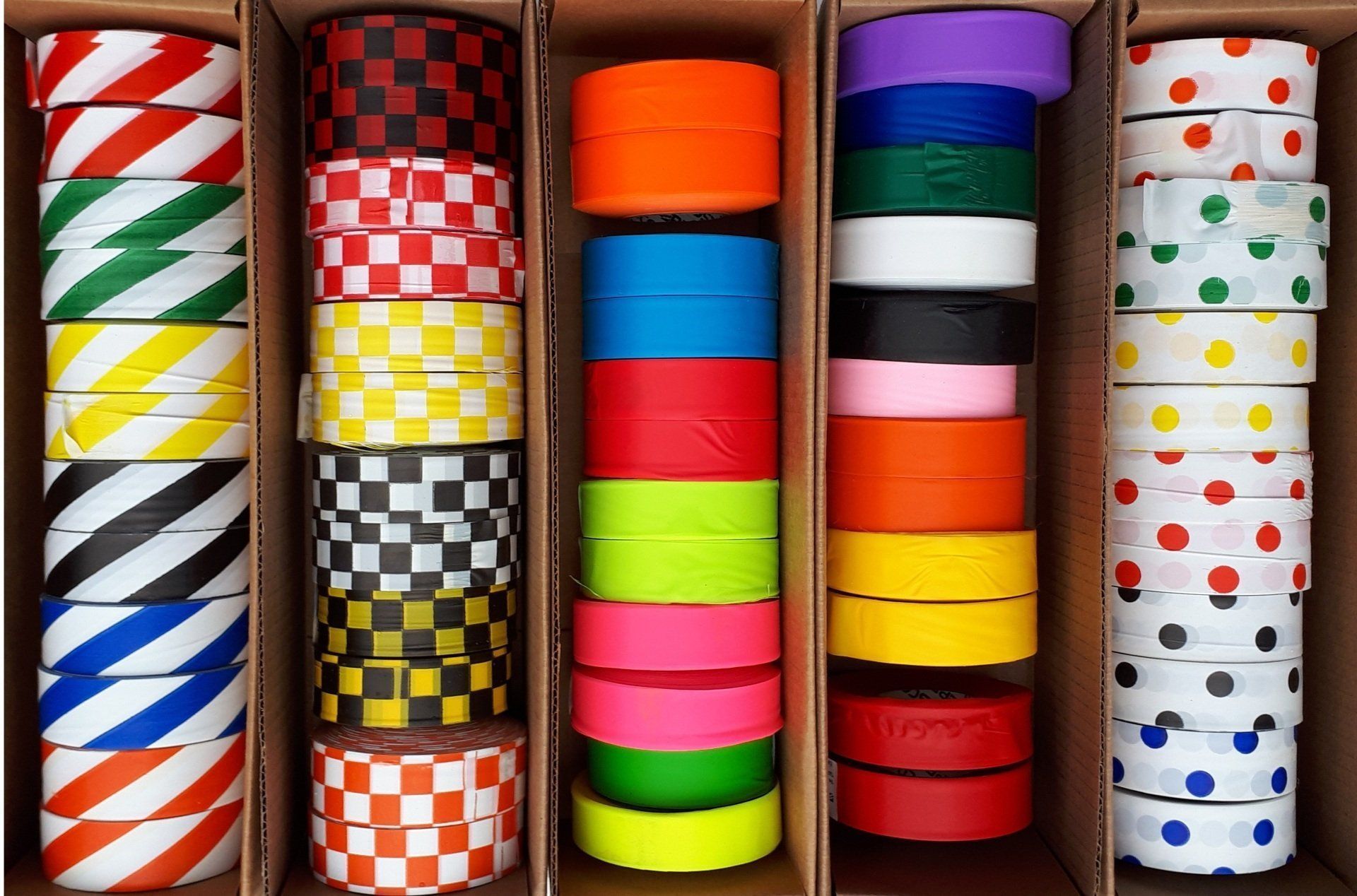 - Checkerboard 1¼" Variety Pack (12 rolls, 2 of each): red/black, red/white, yellow/white, black/white, yellow/ black, orange/white